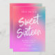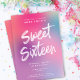 Esta festa de aniversário doce moderna, de 16 anos, apresenta um fundo gradiente colorido em tons de rosa, aqua e roxo com escrita de pincel branco e tipografia moderna. A saudação do guiamento diz "Doce Dezesseis". Você também pode remover o plano de fundo do gradiente e substituí-lo por uma cor sólida de sua escolha. Você pode até adicionar uma foto atrás! Basta clicar em "personalizar design" no menu suspenso de personalização.