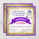 Um bonito aniversário de unicórnio roxo e brilhante, que apresenta um doce bebê unicórnio arco-íris no canto superior direito da frente do convite, cercado por um quadro de ouro com borda prateada e roxa, com todos os detalhes personalizados do partido. No verso há uma versão maior do unicórnio. Ela senta-se a dentro do brilho (impresso) e da poeira de fada dentro o quadro dourado, prateado e roxo ao redor do exterior. O próprio unicórnio tem uma buzina dourada, mané azul brilhante e cascos rosa bonito.