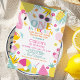 Colorido No primeiro aniversario da Festa da Piscina Solar Convite à piscina Colorida, praia ou primeiro convite de aniversário ao ar livre de uma menina com boia rosa, sol, bola de praia, sorvete, bebidas tropicais e muito mais. Este convite para primeiros aniversarios de verão para meninas coloridas é uma maneira fofa de definir a cena para uma primeira festa de aniversário colorida.