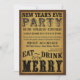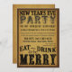 COMA, BEBA, & SEJA ALEGRE -- Convites de festas 2011-2012 da véspera de Ano Novo -- Divertimento, na moda, e convites disponíveis da festa natalícia do ano novo do vintage para sua evento, partido de comensal, cocktail, ou celebração festiva da casa aberta -- Rotulação detalhada e ornamentado do roteiro do preto do estilo da tipografia com tipografia extravagante da era do Victorian no fundo antigo envelhecido do playbill do pergaminho. Apenas incorpore sua informação para criar seu próprio convite personalizado original elegante e à moda da festa natalícia a preço disponível. Selos postais de harmonização de coordenação, canecas, botões, etiquetas, presentes na moda e favoritos para festas disponíveis em cima do pedido.