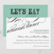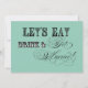 Fontes elegantes e divertidas anunciam a mensagem, "Vamos coma, beba e se case!" em um belo e maravilhoso Concurso de Casamento. Em um aqua quente azul, preto e branco - é o melhor de vintage com uma reviravolta moderna. O lado frontal tem o texto, "janto de ensaio" e o texto do convite que é facilmente personalizado através do modelo. No verso está o texto "Vamos Eat Drink e ser casado" em tipos de letra maravilhosos do estilo Circus. Existe um conjunto completo de produtos disponíveis com este design e podemos fazê-lo em qualquer combinação de cores que desejar.