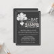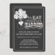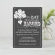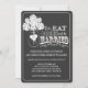 Vamos come, bebe e se casa! proclama este convite de casamento divertido no estilo popular de chalkboard. A tipografia branca é divertida e caprichosa, mas moda. O boião Mason transbordando com hortênsias brancas é uma ilustração original e contém as iniciais do casal feliz num coração amarrado ao pescoço.