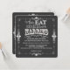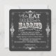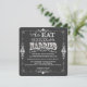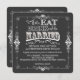 Vamos come, bebe e se casa! proclama este convite de casamento divertido no estilo popular de chalkboard. A tipografia branca é divertida e caprichosa, mas moda. No verso, um jarro de pedras que transborda com híbridos brancos é uma ilustração original e contém as iniciais do casal feliz num coração amarrado ao pescoço.
