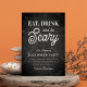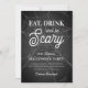 Coma, beba e seja assustador! Estes convites festivos e assustadores para as festas do Dia das Bruxas apresentam um fundo de quadro-negro e tipografia branca num fundo de teia aranha.