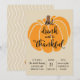 Celebre o dia de Ação de Graças com o nosso moderno convite de festas de janto de Dia de Ação de Graças "coma, beba e seja grato". Nosso convite para na moda e tendências apresenta uma abóbora cheia de padrão grande com script de caligrafia. Sacudir o convite para encontrar um plano de fundo de padrão correspondente para um toque especial extra.