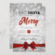 Festa Elegante de Natal / Festa de Natal / modelo de Convite de festas de inverno com a design de tipografia "Comer, Beber e Ser Feliz" e o Motif de neve da Terra Maravilha de inverno em Prata. Excelente a ser usado para festas de janto Corporativo, bolas e galas de inverno, gravata negra / eventos e festas de escritório.