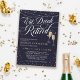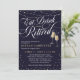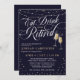 Elegante Coma, Beba e Seja Aposentado convite de festas com luzes de cordas, estrelas e explosões, e flautas de champanhe contra um fundo azul escuro profundo. Convide seus amigos, familiares e colegas de trabalho para uma noite de comemoração da sua aposentadoria com estes glamourosos convites de aposentadoria em azul escuro com flautas de champanhe se agarrando e luzes mágicas de cordas!