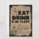 East, Beba e seja assustador! Arte de esqueleto, aranha, cerveja e linha de vinho desenhada à mão num fundo kraft maravilhosamente assustador para os seus convites para o Dia das Bruxas.