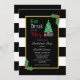 Coma, beba e seja feliz convite de festa de solteira de Natal com uma árvore de Natal e presentes contra uma estrutura de ouro. Fundo listrado a preto e branco com holocre