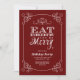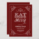 Design de convite para festas de Natal modernas e elegantes, com tipografia caprichosa que lê Comer, Beber e Ser Feliz. O plano de fundo tem uma borda com detalhes de canto de rolagem vintage. Use as ferramentas de design para personalizar fontes, mover texto e criar seu próprio design de convite exclusivo.