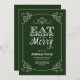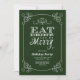 Design de convite para festas de Natal modernas e elegantes, com tipografia caprichosa que lê Comer, Beber e Ser Feliz. O plano de fundo tem uma borda com detalhes de canto de rolagem vintage. Use as ferramentas de design para personalizar fontes, mover texto e criar seu próprio design de convite exclusivo.