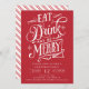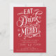 Este convite de festas de Natal, intitulado "Coma bebida e seja feliz", mostra o espírito festivo com a sua tipografia e o seu fundo vermelho vibrante. O convite dá o tom perfeito para uma comemoração alegre, convidando convidados a se juntar ao prazer da temporada de festas.