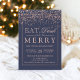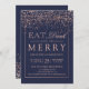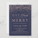Coma Bebida e Seja Feliz Festa de Natal | Comemora-se a época de férias com este moderno falso rosa dourado confetti, quadro e tipografia elegante em azul-da-meia-noite, marinho azul.
