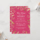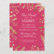 Bonita cor-de-rosa com folha de ouro falsa e convite de festas de Natal de design de morango vermelho que se lê "Coma, beba e seja feliz" numa mistura de fontes de blocos e scripts e impresso a tinta branca. Personalize este convite usando o modelo, cada linha de texto é totalmente personalizável.