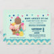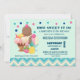Convite para chá de fraldas temático de sorvete para um bebê. Colocado sobre um fundo verde da casa da moeda com uma borda azul e creme. Confetti colorido (IMAGE, NOT REAL CONFETTI) no topo. Ilustrado com desenho de um sundae de sorvete de 3 furos com bordos coloridos. Um cone de sorvete com colheres de chocolate e sorvete de baunilha. Uma tigela de sorvete neopolita com uma cereja em cima. Morangos e uma fruta de abacaxi sentam ao lado das tigelas.