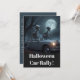 Um panfleto para um passeio de carro de Halloween tem um motorista esqueleto e navegador no carro, com uma lua grande e cheio. A parte de trás é uma cinza azul escura, com detalhes adicionais para a manifestação. Um design divertido para um esporte de carro divertido!