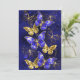 Composição de borboletas luxuosas de safira e joias de ouro em fundo azul texturizado.