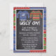 Diversão e brega é o que são as férias! O design perfeito para a sua festa de doce de Natal feio! A design apresenta um fundo com quatro blocos de suéter de malha em vermelho e verde tradicionais com árvores de Natal e azul com pinheiros e renas. No centro há um quadro negro, como uma área retangular, com guarnições brancas. Dentro da área do quadro são dois suéteres de Natal feios. Na camisola azul com pinheiros e renas. Há uma grande rena branca no centro da frente do suéter. O outro suéter feio é vermelho e verde com floco de neve nórdico e padrões de árvores de Natal. Na parte inferior da área do suéter está o texto em giz branco, como uma fonte que diz: ATIVE-te! Festa feia de suéter de Natal. Abaixo está um texto personalizável no qual você pode adicionar seus detalhes da festa Ugly Christmas Sweater. O verso do convite está coberto pelo padrão de blusa azul de natal.