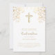 Um elegante convite de comunhão com detalhes dourados em um fundo branco. Personalize usando os modelos para criar um visual único. Com redemoinhos ornamentados e flores em ouro, ele comemora este importante evento. Uma cruz simples no centro está na frente e no verso.