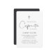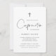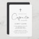 Convide familiares e amigos para comemorar a comunhão do seu filho com estes convites modernos e mínimos em preto e branco clássico. O design simples apresenta "Comunhão" em um roteiro manuscrito casual, com detalhes de sua cerimônia e celebração abaixo em letras pretas suaves e modernas. Uma pequena ilustração de cruz moderna completa a design.