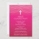 Lindo convite da Primeira Comunhão apresentando um rico e delicado pátria com uma cruz branca pendurada sobre um fundo chic e popular único de cor rosa-ombre fuchsia. Sacudir o convite para encontrar um ombre de volta para um toque especial extra. Disponível em nosso compro em uma variedade de cores para uma garota ou um garoto.