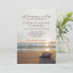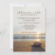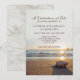 Convite para comemoração elegante, com uma concha deitada na praia ao nascer do sol. O fundo tem um fundo de mármore.