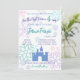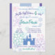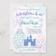 Convidado minimalista no inverno com púrpura pastel, blues e chaleiras. Flocos de neve, castelo e diversão gelada para um mágico 4º aniversário! Detalhes editáveis para um convite fácil e pronto para envio.