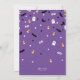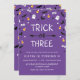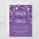 Um truque roxo bonito, assustador ou três convites de festas de aniversários de Halloween com confete de fantasmas, globos oculares, milho doce, morcegos e calçados e vassouras de bruxas. O truque ou Três está rodeado pelo confetti; abaixo está o texto personalizado do convite de festas. Você pode até mesmo mudar a cor de fundo usando a ferramenta Personalizar/Personalizar.