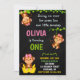 Convite de aniversário de macacos Convite de primeiro aniversario de menina Um convite para a festa da selva. Este pequeno convite para macacos tem um fundo escuro, três meninas macaquinhas em lianas e bananas. Vamos a uma festa da selva! Uma comemoração selvagem com estilo macaco! Simplesmente edite este modelo fácil de usar e altere todos os textos para torná-lo especial.