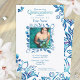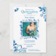 Coloque sua foto facilmente. Este convite para Quinceañera azul floral irá apresentar a sua fotografia num quadro decorativo azul floral. O papel de carta de papel floral floral Elegante nesta coleção oferece uma variedade de formas e tamanhos. Esta design de cristal azul é versátil para uma quinceanera de inverno ou primavera.