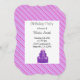 Um bonito design com faixas roxas diagonais suaves acentuadas por uma introdução branca para informação e um bonito sotaque de bolo de aniversário.