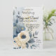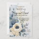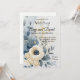 Um convite de casamento refinado, com um design boêmico minimalista com sotaques de cor aquosa em azul empoeirado, creme e amarelo pálido. No centro, uma delicada flor de creme é rodeada por folhas de eucalipto e prigos de ouro. O fundo branco limpo e as sutis texturas de bruxaria criam uma estética elegante e moderna, perfeita para casais que buscam um eterno, mas relaxado, estilo de casamento. Dusty Blue