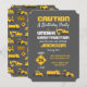 Convite de aniversário de caminhões de construção. Cinza, esquema de cor amarelo, preto e branco com caminhão de construção, sinal de precaução e padrão de cone de construção.