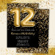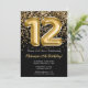 Convite de aniversário preto e ouro elegante para uma menina de 12 anos com roteiro elegante escrevendo design de fonte dourada e balões de folha divertida.