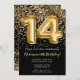 Convite de aniversário preto e 14 de ouro elegante para uma menina de 14 anos com script elegante escrevendo fontes douradas e balões de folha divertida.