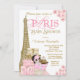 Convite para o chá de fraldas de Paris com belos pacotes de presentes de ouro Eiffel Tower, elegante rosa e dourado em Paris, doce menina com roupa cor-de-rosa e uma corda de pérolas, roteiro de Paris cor-de-rosa-rico num fundo floral rosa bonito. Este belo convite para o chá de fraldas de Paris é facilmente personalizado para o seu evento, simplesmente adicionando os seus detalhes no estilo de letra e cor, e a redação da sua escolha. Este é um design impresso sem diamantes reais, joias, brilho, etc.