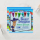 Chá de fraldas Fiesta convidada com um bebê giro vestindo uma roupa sombria azul escura em um fundo festivo de serpente multicolorido. Estes adoráveis convites para o chá de bebê mexicano Fiesta são facilmente personalizados para o seu evento simplesmente acrescentando os seus detalhes.