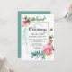 Lindas peônias cor-de-água cor-de-rosa, com um toque de ouro de damasco decoram uma fina estrutura de ouro neste elegante modelo de convite batizante. É muito fácil substituir o texto de amostra pelo seu. Christening está escrito em um texto fluente. O restante do texto é uma fonte serif clássica. A parte de trás do convite é azul.