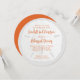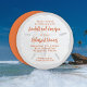 Convites redondos com texto impresso sobre uma imagem realista de areia branca e dólar. Fundo de cinzas neutra com texto cor de laranja que é criado para uma celebração do janto de ensaio. Também pode ser usado para qualquer outra pré-festa de casamento, ou café da manhã de casamento.