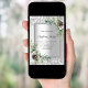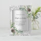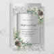 Fundo de aspecto fino prateado decorado com cones de pinheiros, bagas brancas, folhas verdes, brilho falso prateado, brilhos. Personalize e adicione os detalhes da sua festa. Letras negras.