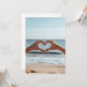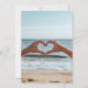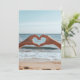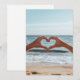 Duas mãos se unem para formar uma forma cardíaca contra um pano de fundo sereno de praia, simbolizando amor, conexão e tranquilidade do mar