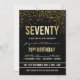 Este seventieth convite de aniversário formal, elegante, na moda, moderno é apropriado para homens ou mulheres. Compreende linhas limpas douradas, o roteiro gótico caixa à moda e o texto fixo sofisticado da folha de ouro do falso em um fundo preto com os chás do confete sparkling, cintilante do ouro e das flâmulas do partido. O texto foi projetado ser tão simples como possível personalizar e Zazzle tem uma grande variedade de carácteres tipo diferentes a escolher de. Note por favor que todos os convites de Zazzle são plano impresso e que a folha e os confetes do brilho são efeitos digitais.