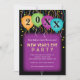 Este convite de festas de Ano Novo apresenta balões de cores brilhantes, navios a vapor multicoloridos e estrelas de confete em um fundo preto. Cada balão tem um número para fazer o próximo ano. O texto personalizável, em um fundo roxo abaixo dos balões, otimizadores e confetti, permite que você adicione os detalhes de sua parte.