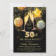 Um dinâmico convite de aniversário ousado 50º com óculos de champanhe, balões e confete dourado, ouro a preto. Folha de ouro falsa na parte de trás do convite.