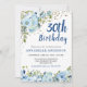 aniversário de 30 anos Blue Floral Watercolor Dourado Confetti Invitation O design apresenta belos azuis e florais verdes.