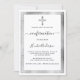 Um moderno, elegante e convite. Um fundo branco decorado com uma cruz de prata falsa e quadros de prata falsa. Personalize e adicione um nome e detalhes. Texto preto.