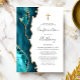 A borda esquerda deste elegante convite de confirmação moderno apresenta uma cor azul-lacrimogênea agata borda cortada com falso brilho dourado. Uma cruz falsa de folha de ouro aparece acima do texto personalizável, que combina escrita manual, copperplate e fontes itálicas em cinzas de carvão em um fundo branco. O verso apresenta um design de chaleira e de agata dourada.