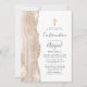 A borda esquerda deste elegante convite de confirmação moderno apresenta uma borda agitada com aquarela marfim aparada com falso brilho dourado. Uma cruz falsa de folha de ouro aparece acima do texto personalizável, que combina escrita manual, copperplate e fontes itálicas em cinzas de carvão em um fundo branco. O verso apresenta um marfim correspondente e um design de agate dourado.