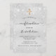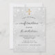 Um convite de confirmação moderno, elegante e minimalista para rapazes ou raparigas. Fundo metálico de aspecto fino prateado decorado com poeira falsa brilhante. Personalize e adicione um nome e detalhes. Letras pretas coloridas.