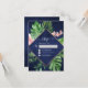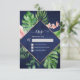 Cartões de Confirmação de Casamento com Folhas de Palma Verde Tropical e Flores Rosa Bege Aquarela com Folha Dourada Rosa Falsa em Fundo Geométrico Azul Naval - inclui tipografia de script bonita e elegante com flores botânicas tropicais modernas e folhagens para a celebração especial do dia do casamento.